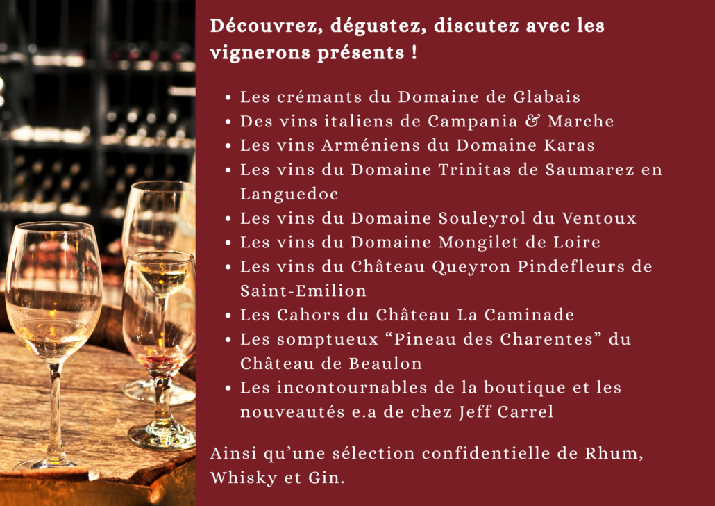 Les vins qu’il propose sont pour la plupart originaires de France. L’Italie, l’Espagne, le Portugal, la Roumanie, l’Argentine, sans oublier la Belgique… sont aussi régulièrement mis à l’honneur.Louis n’est jamais aussi heureux que lorsqu’il peut conseiller un accord mets-vin et complète d’ailleurs son activité première par des ateliers « Initiation aux vins ».Aussi chaleureux que son produit festif, le caviste est aussi un homme moderne qui publie sur Facebook ses recommandations et mots du jour…